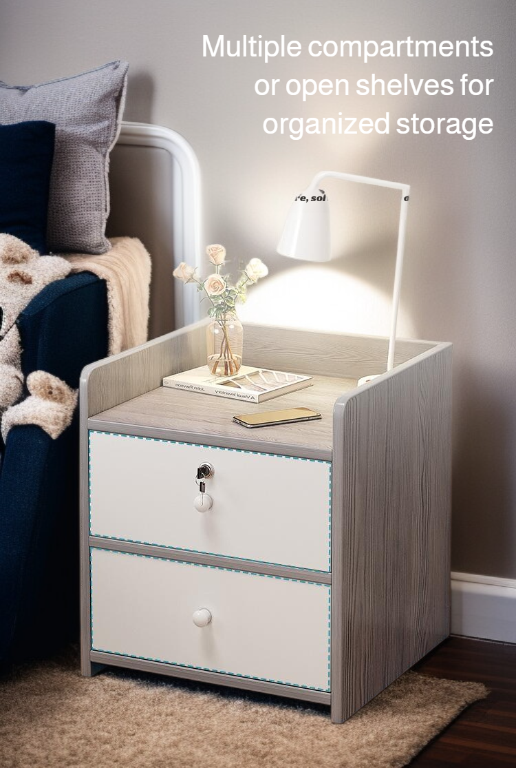 Space-saving design, durable materials, easy assembly, versatile storage, complements modern bedrooms, smooth surface for easy cleaning, neutral color fits various décor styles.